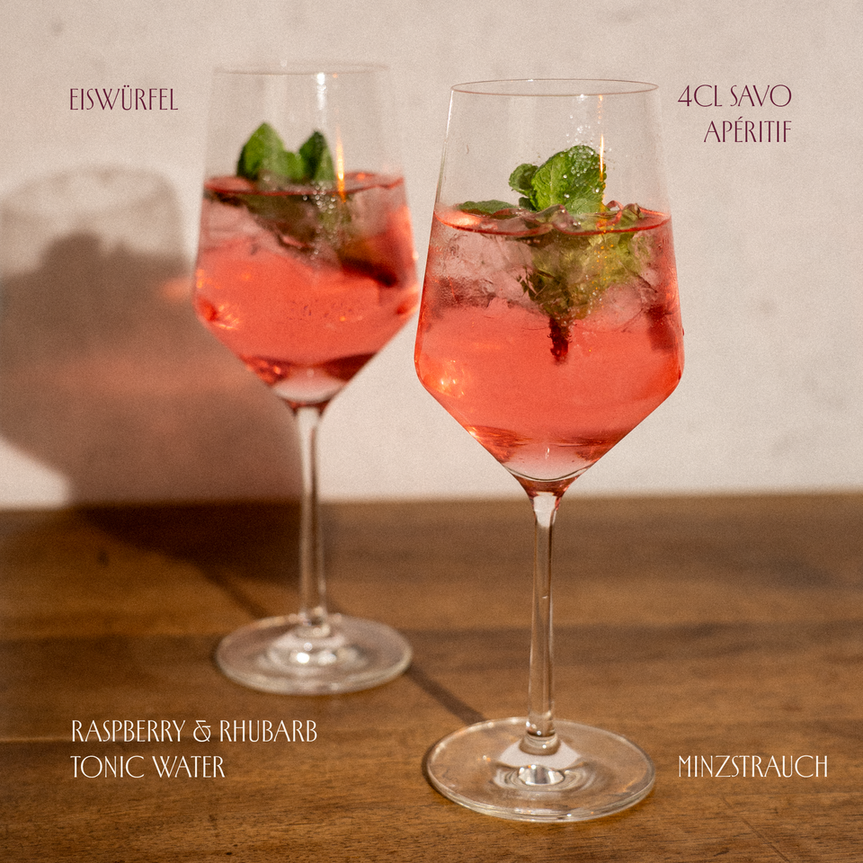 SAVO Apéritif und Eiswürfel ins Weinglas geben. Auffüllen mit Raspberry & Rhubarb Tonic Water und einem Minzstrauch verzieren.