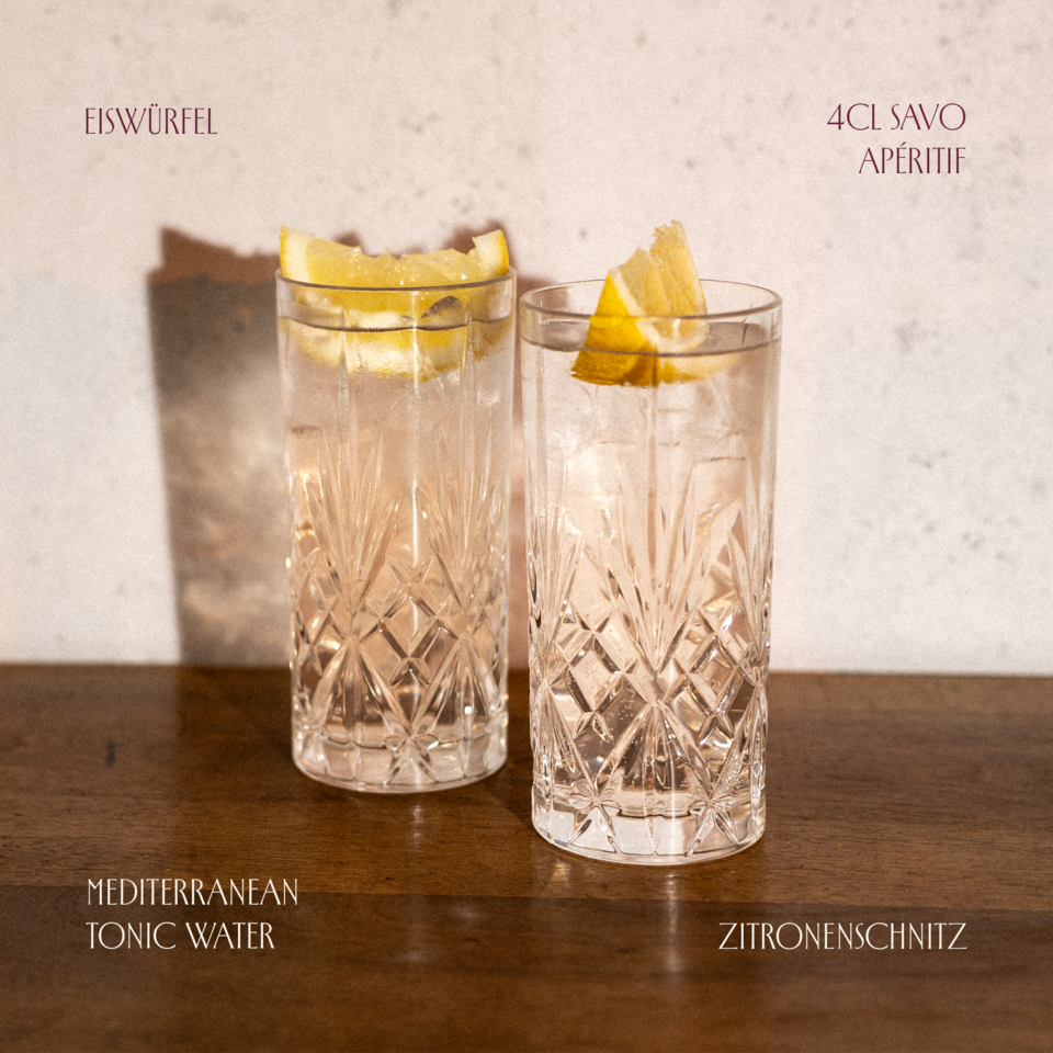 SAVO Apéritif und Eiswürfel ins Longdrinkglas geben. Mit Mediterranean Tonic Water auffüllen und einem Zitronenschnitz verzieren.