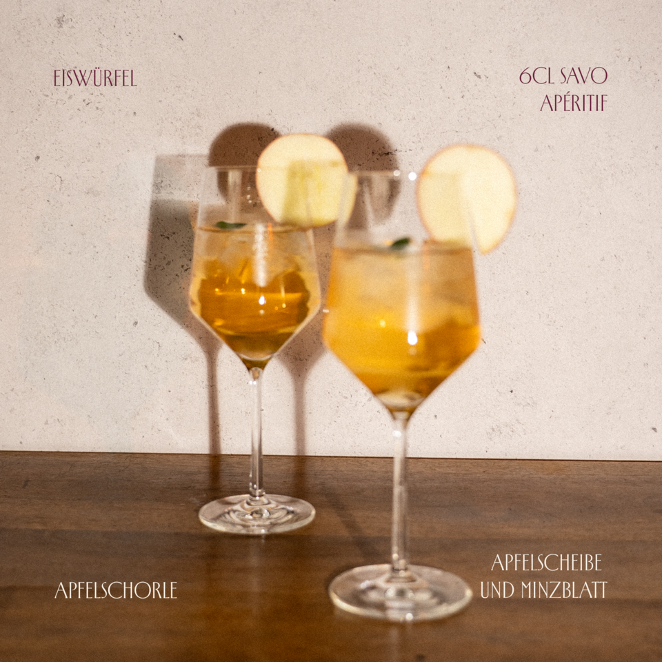 SAVO Apéritif und Eiswürfel ins Weinglas geben. Auffüllen mit Apfelschorle. Mit einer Apfelscheibe und einem Minzblatt verzieren.